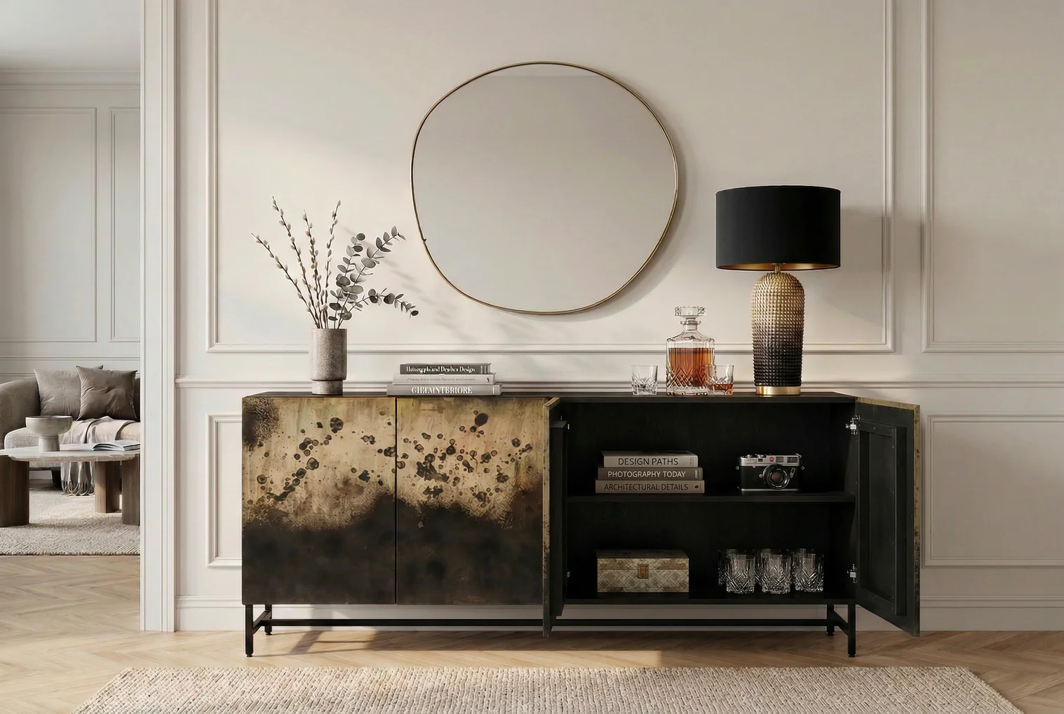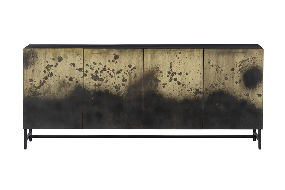 A négyajtós és négy tágas rekeszes komód rengeteg tárolóhelyet kínál. Akár edények, poharak, dísztárgyak vagy dokumentumok tárolására használja a helyet, Önön múlik. Az ajtók praktikus, lágyan záródó mechanizmussal vannak felszerelve, amely biztosítja a csendes és lágy záródást. A finom, porszórt vaskeret stabilitást, tartósságot és modern, lebegő megjelenést biztosít. Exkluzív tárolófelület, amely tökéletesen ötvözi a kiváló minőségű anyagokat, az átgondolt funkcionalitást és a jellegzetes dizájnt. A komód egyedi bútordarabként szolgálhat otthona számára.